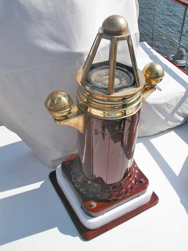 Designed to be used with "liquid compasses of standard sizes" to determine the bearing (azimuth) of objects at sea. Whatever compass was used had to be "prepared" by drilling an indentation in the very center of the glass to take the center pin. A swinging mirror (attached to the left side sight vane) allowed bearings of celestial objects, and a sliding eye shade on the right vane allowed bearings of the sun. Alternatively, sun bearings can be taken by lining up the shadow of the vertical thread with the line on the white section. Accurate sun bearings can be used to check compass variation at sea. For more details click on the catalog scan bottom right. Produced in 3 sizes which sold for $18.00, $20.00, or $22.00 in 1907. I don't know which size mine is, but overall length (vanes folded) is 7.5 inches, and the legs are 4.3 inches apart, requiring a compass face of at least 5 inches. This fits my No. 63 compass which has been "prepared" for this instrument.