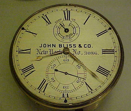 By this time the Bliss company was using movements made by London maker Victor Kullberg. This is a typical Kullburg reverse-fusee movement with a basic "Earnshaw" style balance. No auxiliary compensation was needed on a survey chronometer, and at this time the Navy no longer accepted chronometers with auxiliary compensation because of the difficulty of keeping them in adjustment. The fact that this has a steel hairspring may indicate that it was made for sale to the Navy. At this time John Bliss & Co., like some other makers, often used palladium hairsprings which are resistant to rust, magnetism, and are less affected by temperature. The Navy, however, demanded steel hairsprings on chronometers made for them. Palladium hairsprings, which are silver to white in color, were known to be softer and harder to work with than steel.