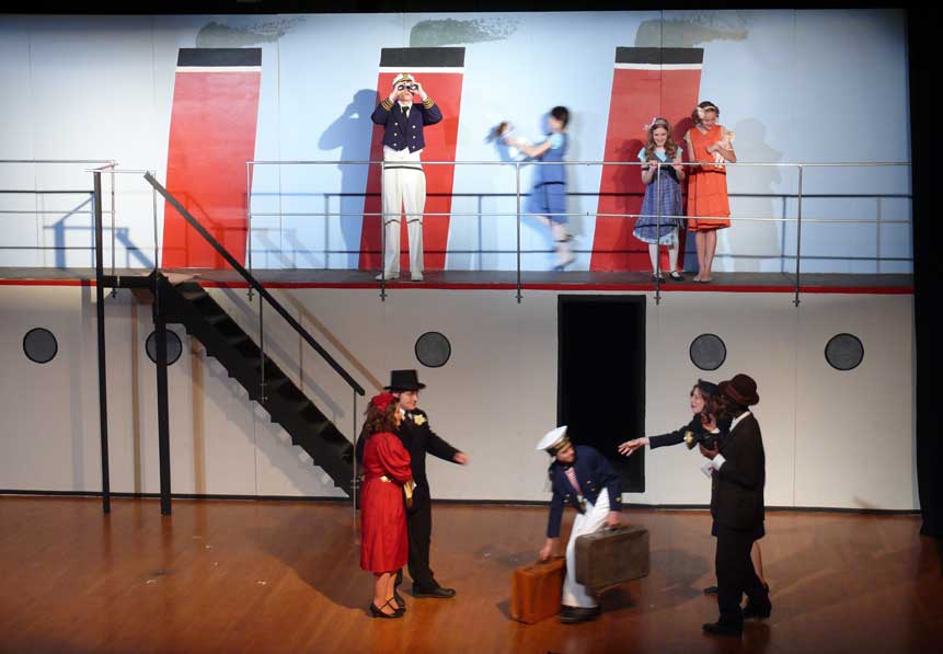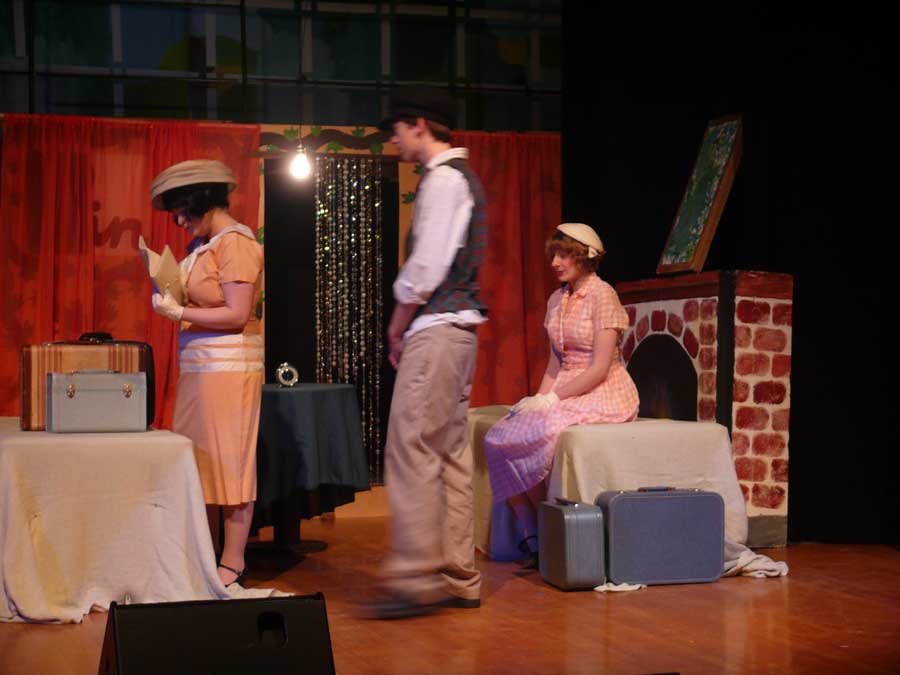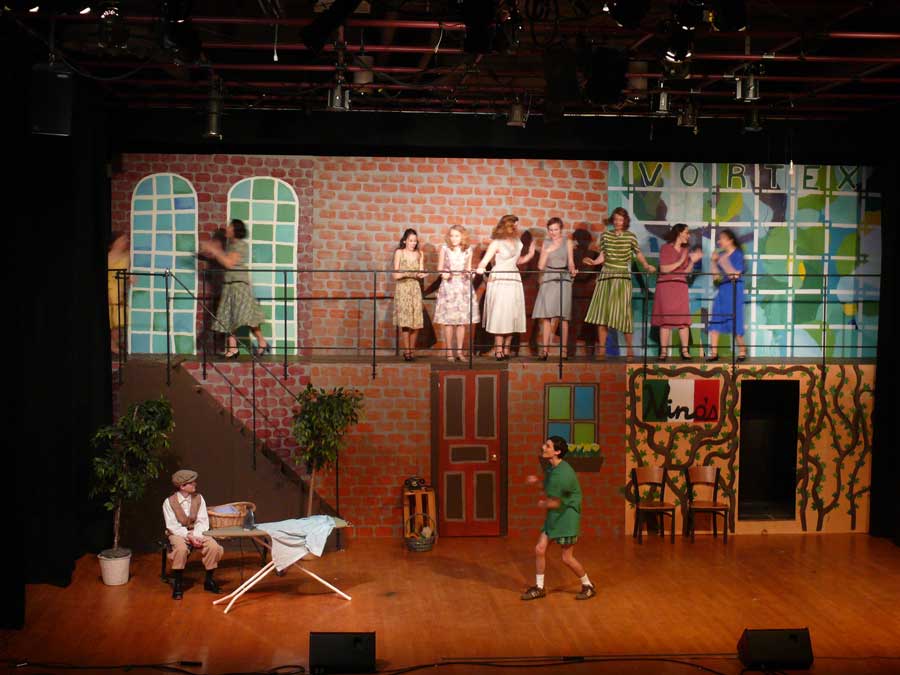 Reused set components from "Anything Goes", center door is practical, stairway was moved. We gave the basic design to an art class. Each member of the class created a model as a class project. The chosen artist got to paint the full-sized scene.