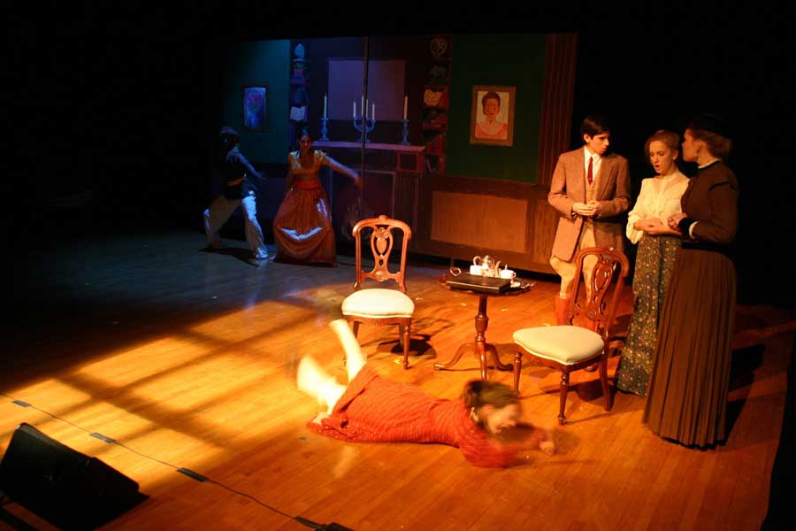 Except for freestanding doorframes, set exclusively furnishings; paintings were hung from lighting grid, just forward of back curtain. Lighting separated school (left) from house (right), colors indicated time of day. Lamps were practical.