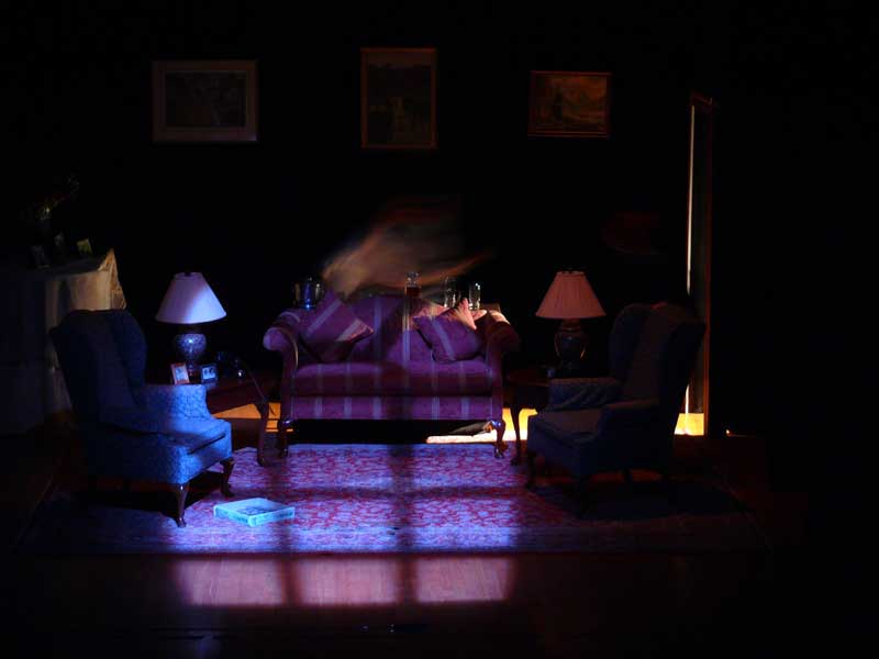 Night scene in house, 'hall light' projected through doorway SL, window gobo.