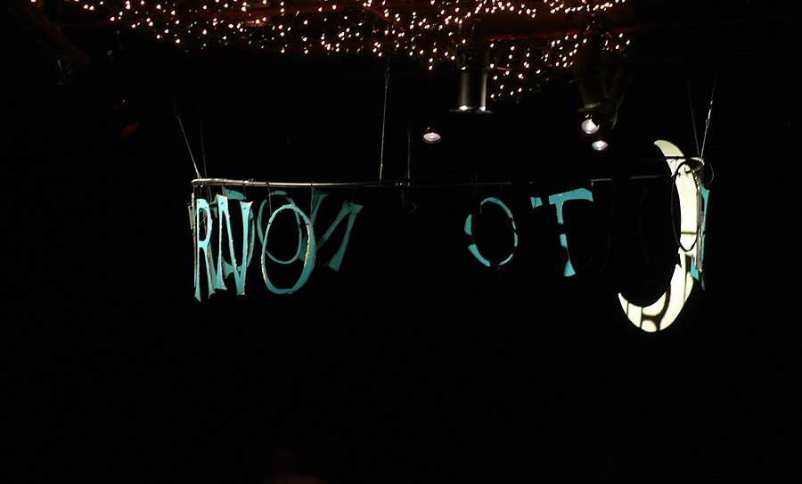 "Welcome to Nocturno" sign was cut-out letters hung from circular frame. Frame, moon & Christmas light stars all hung from lighting grid. Frame suspended by wires, with improvised nylon cord fly system to raise sign when not needed.