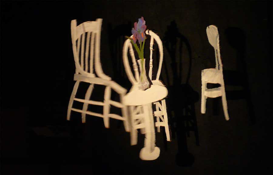Cardboard cut-outs of still life scene hung from grid against black drape, illuminated when Iris had flashbacks to her old life.